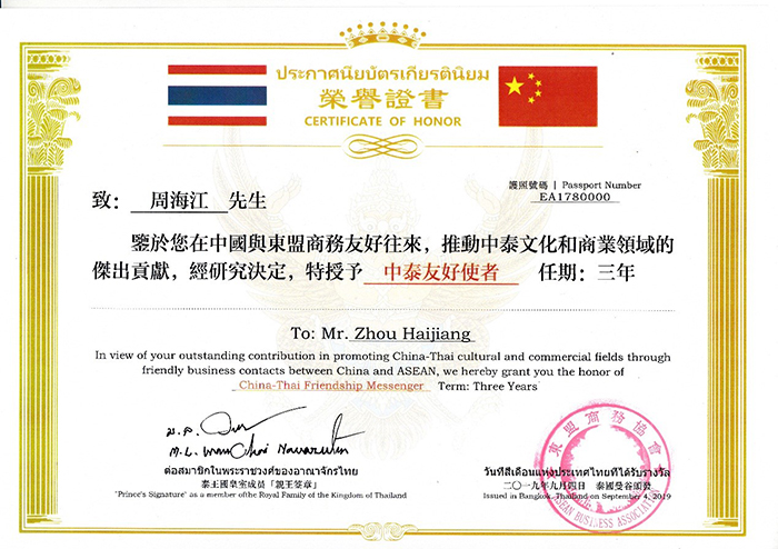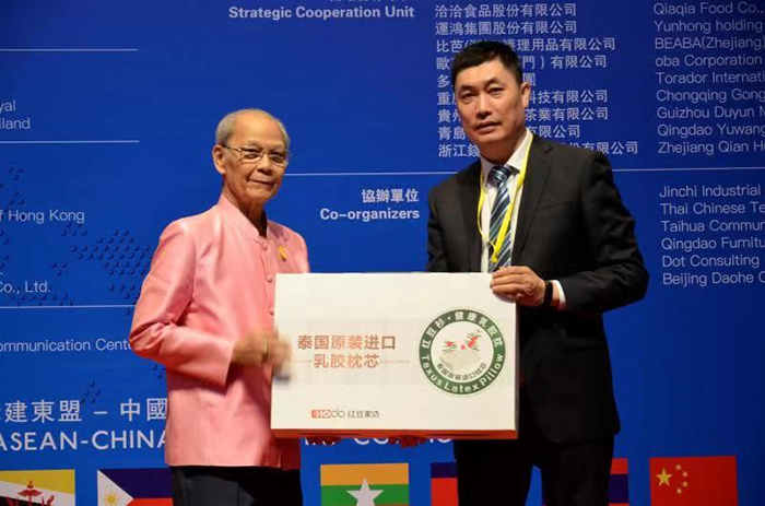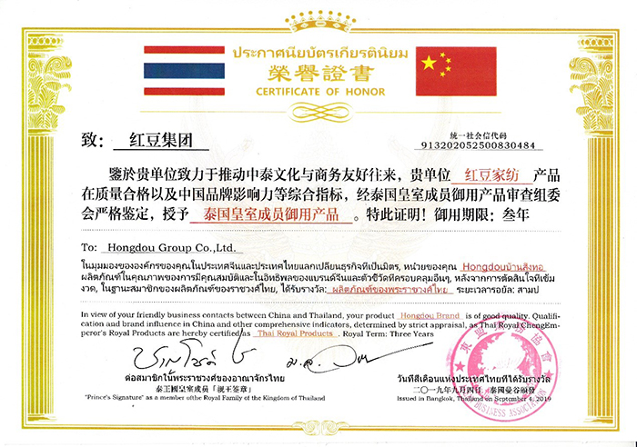 2019年9月4日,紅豆集團(tuán)紅豆家紡公司應(yīng)邀參加2019年?yáng)|盟經(jīng)貿(mào)發(fā)展(曼谷)合作論壇,紅豆家紡公司總經(jīng)理錢振宇先生帶領(lǐng)一行人員參加此次會(huì)議,紅豆家紡首次走出國(guó)門,詮釋對(duì)健康水碾、舒適生活的全新定義,從而引領(lǐng)健康睡眠的需求。在此次會(huì)議上,紅豆家紡公司總經(jīng)理向泰國(guó)旺猜親王進(jìn)貢紅豆乳膠枕、紅豆襯衫,獲得皇室旺猜親王的高度評(píng)價(jià),并授予紅豆集團(tuán)紅豆家紡產(chǎn)品為“泰國(guó)皇室御用產(chǎn)品”。同時(shí),錢振宇先生代表紅豆集團(tuán)董事局主席兼CEO周海江,接受中泰國(guó)王勛章,中泰友好使者榮譽(yù)。