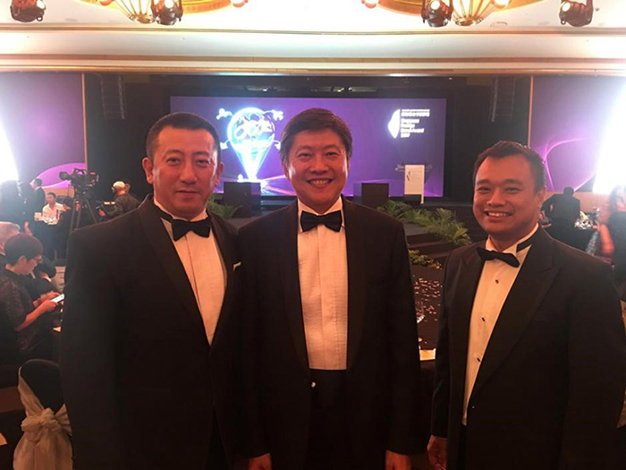 紅豆新加坡公司執(zhí)董傅浩代表紅豆集團(tuán)領(lǐng)取“中國(guó)十大行業(yè)領(lǐng)軍品牌”獎(jiǎng)杯