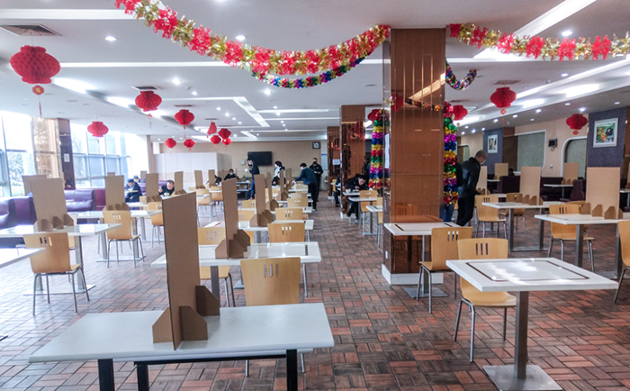 兵馬未動糧草先行。在復(fù)工之前,公司利用現(xiàn)有資源通過各種渠道采購了大量口罩,防護(hù)服、酒精、消毒液等防疫物資也已全部到位。公司食堂實(shí)行人員錯峰分流措施,員工就餐分時分批、限時限流,避免人員在食堂中聚集,進(jìn)食堂前需檢測體溫,排隊取餐需間隔一米,每桌限坐2人,中間用板隔開,且一律同向而坐,避免隔桌交談。