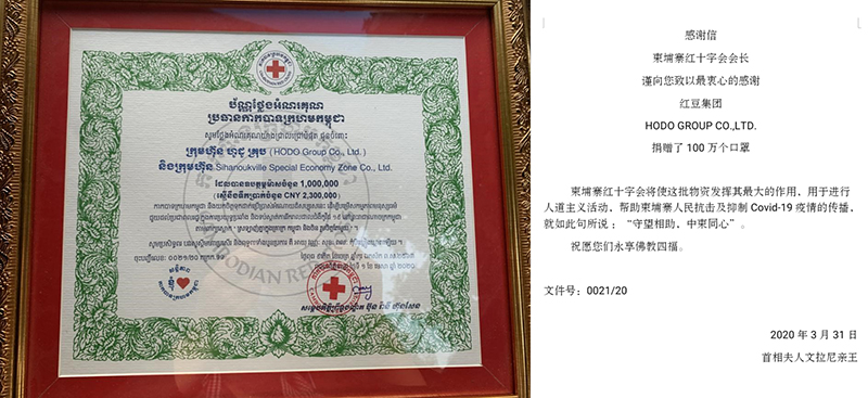 儀式上,西港特區(qū)公司總經(jīng)理曹建江代表西港特區(qū)中方控股股東紅豆集團(tuán)接過了柬埔寨紅十字會頒發(fā)的感謝狀,這張由柬埔寨紅十字會會長、首相洪森夫人文拉尼親王署名的感謝狀高度肯定了紅豆集團(tuán)捐贈柬埔寨100萬只口罩的義舉,“柬埔寨紅十字會將使這批物資發(fā)揮其最大的作用,用于進(jìn)行人道主義活動,幫助柬埔寨人民抗擊及抑制Covid-19疫情的傳播”。