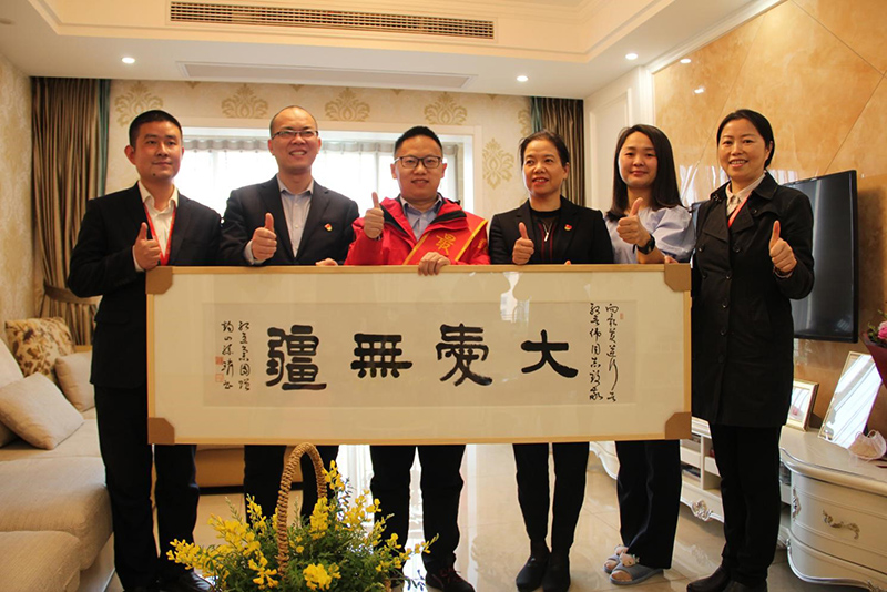 下午,紅豆集團常務(wù)副總裁、國際公司董事長戴敏君,集團品牌文化部部長錢文華率紅豆物業(yè)團隊來到殷晉偉家,上門送上最誠摯的慰問,贈予殷晉偉“大愛無疆”牌匾,代表紅豆集團全體員工向英雄表達(dá)崇高敬意!“大愛無疆”牌匾由中國書法家協(xié)會理事、無錫市國畫院院長孫璘先生親自揮毫?xí)鴮?,筆鋒蒼勁有力,一筆一畫盡顯孫璘先生對“逆行英雄”的真情真意?!?/p>