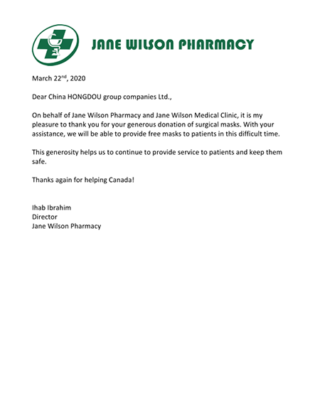 同時(shí),紅豆又向加拿大藥店、警察局、診所共捐贈(zèng)1000個(gè)口罩,加拿大方給我們發(fā)來(lái)感謝信。