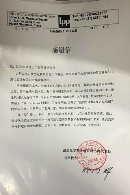 3 月中旬,紅豆向波蘭的這個(gè)客戶返捐600個(gè)口罩,對(duì)方收到口罩后,表示感激,并寫來(lái)感謝信,感謝紅豆的雪中送炭。