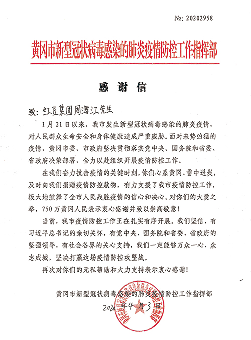 近日,湖北省“黃岡市疫情防控工作指揮部”給紅豆集團(tuán)黨委書(shū)記、董事局主席兼CEO周海江發(fā)來(lái)感謝信,信中說(shuō),“在我們奮力抗擊疫情的關(guān)鍵時(shí)刻,你們心系黃岡、雪中送炭,及時(shí)向我們捐贈(zèng)疫情防控款物,有力支援了我市疫情防控工作,極大地鼓舞了全市人民戰(zhàn)勝疫情的信心和決心。對(duì)你們的大愛(ài)之舉,750萬(wàn)黃岡人民表示衷心感謝并致以崇高敬意!”