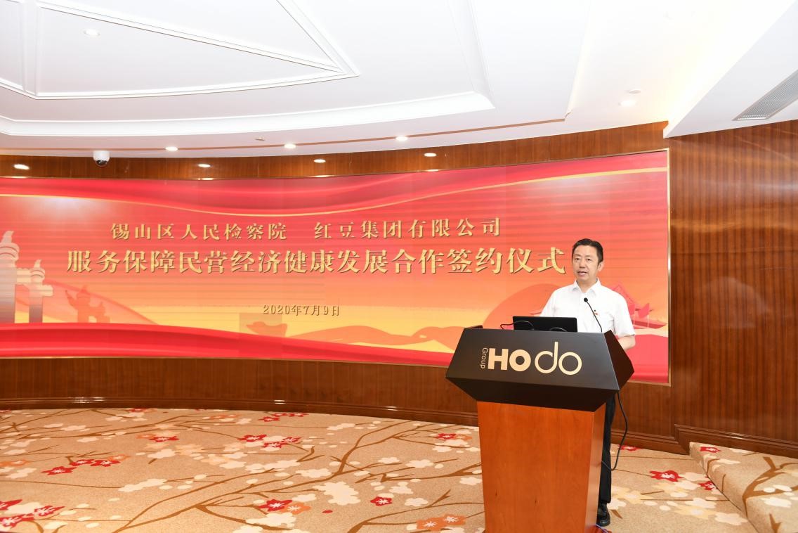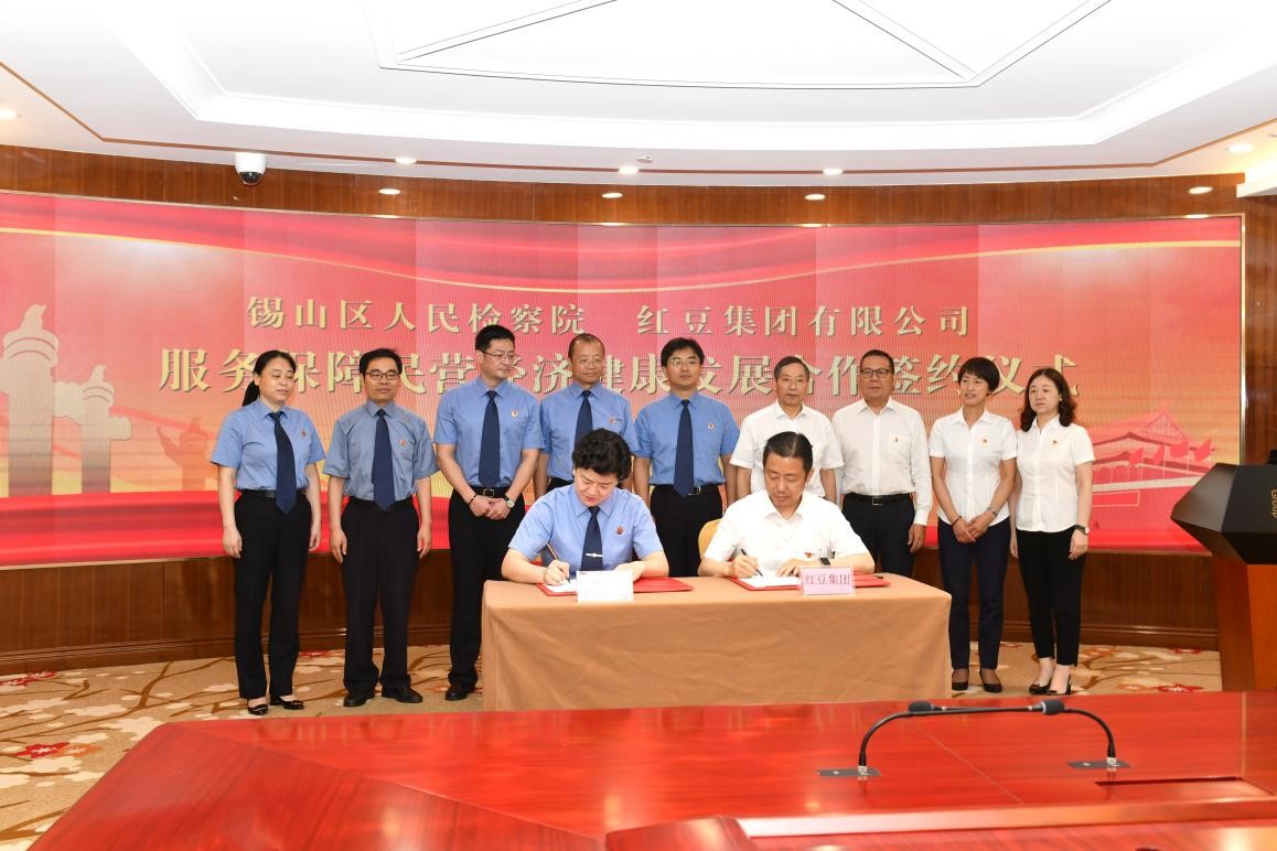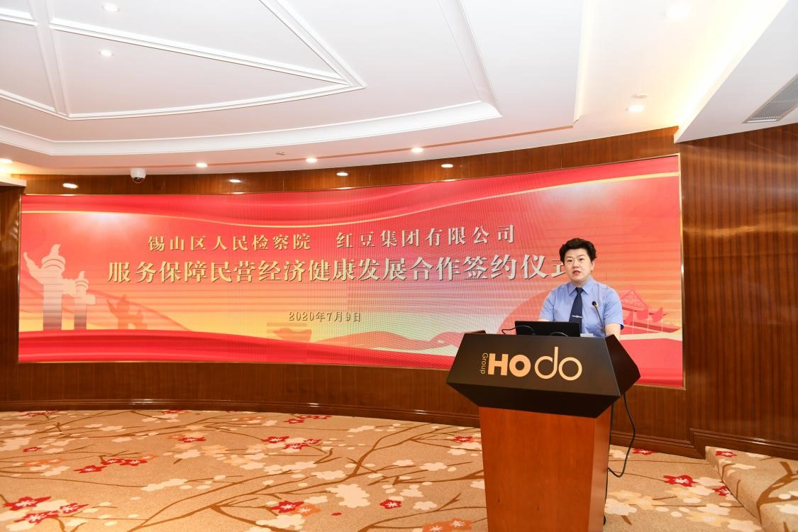 為深入貫徹習(xí)近平總書記在民營企業(yè)座談會上的重要講話精神,落實中央、省市委關(guān)于大力支持民營經(jīng)濟(jì)發(fā)展部署要求,充分發(fā)揮檢察機(jī)關(guān)職能,為民營經(jīng)濟(jì)提供優(yōu)質(zhì)的法律服務(wù)和堅定的司法保障,7月9日,紅豆集團(tuán)與錫山區(qū)人民檢察院在紅豆財富廣場北京廳進(jìn)行服務(wù)保障民營企業(yè)健康發(fā)展合作備忘錄簽約。儀式上,紅豆集團(tuán)黨委書記、董事局主席兼CEO周海江和錫山區(qū)人民檢察院何瑩檢察長代表雙方簽署合約。