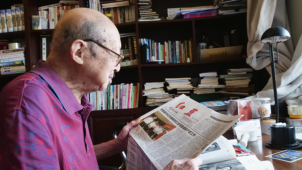 7月29日,今年的七夕前夕,當(dāng)代著名老詩人、作家、文藝評(píng)論家丁芒在家中認(rèn)真錄制著對(duì)紅豆七夕節(jié)20周年的祝福視頻。中國(guó)當(dāng)代詩壇曾有“北臧南丁”之說。丁芒,這位從南通城走出來的大詩人,從抗日戰(zhàn)爭(zhēng)的烽火開始生命的吟唱,80載筆墨為伴,書寫了萬余首激蕩人心的詩篇。面對(duì)記者的拜訪,丁芒和其夫人都十分熱情?,F(xiàn)已96歲高齡的他,看起來依舊面色紅潤(rùn),精神飽滿。在丁芒老先生家中,能夠感受到濃濃的文化氣息,書柜上、書桌上擺滿了各種書籍。雖然已是耄耋之年,丁芒老先生依然每天以書籍為精神食糧,在他的身上,我們看到了一個(gè)詩人對(duì)詩詞的忠貞和熱愛,對(duì)傳統(tǒng)文化的敬畏和崇拜。